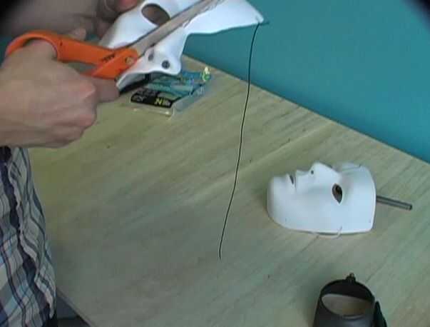 Esto es realmente una construcción muy simple y barata. Tendrás que recortar la mascarilla así que empieza por sosteniendo la máscara hasta el actor que va usar. Utilice un lápiz y marque donde cortar. Quiero esta cosa para adaptarse a los contornos de su actor, por lo generalmente significa podar alrededor de las mejillas y la frente y eliminar la pieza de punta. Estas máscaras de plástico son tan baratas, que usted debe poder cortar con las tijeras regulares.