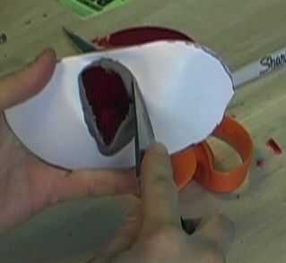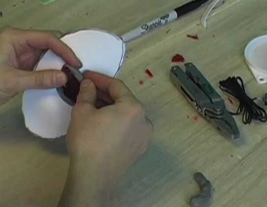Ahora podemos colocar la lente del ojo a la máscara con resina de plomería. Este material es genial! Sacar, mush up y forma a la máscara. Cuando se hace curarla será sólo como de plástico! Para obtener agradables formas y bordes, utilice un cuchillo u otro borde plano para esculpir su epoxi mientras es todavía suave. Otro truco es usar saliva y su dedo para ayudar a suavizar las arrugas. Una vez todo está listo para la pintura.