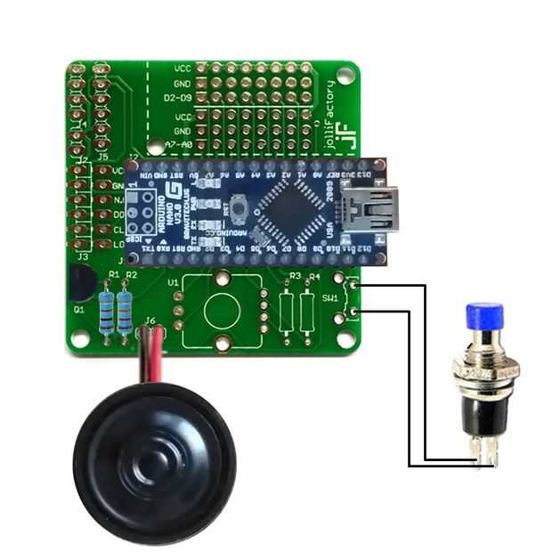 Ver imagen de arriba para ver cómo todos los componentes necesarios se sueldan en el JF interfaz Junta 1 con el altavoz y oprima el botón conexión y montado en Arduino Nano.