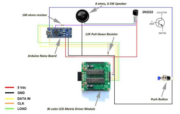 Después de completa el kit, están conectados con el microcontrolador como se muestra en el diagrama de cableado (matriz de LED no instalado para ver mejor). Uno utilizamos 8 ohmios, 0.5W altavoces para la salida de audio de juego y un pulsador para el control del juego. Un Arduino Nano o microcontrolador compatible se utiliza aquí para la configuración del circuito electrónico.