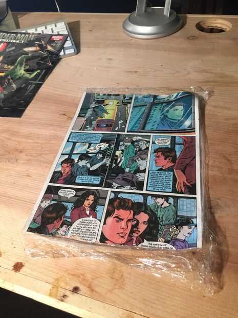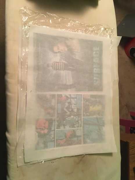 2. colocar un trozo de papel de cera sobre la superficie de planchado, grande lo suficiente como para encajar ambas páginas, vuelva a colocar las páginas en