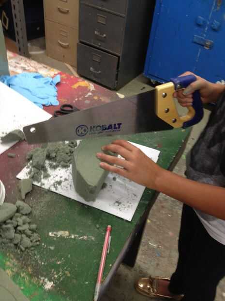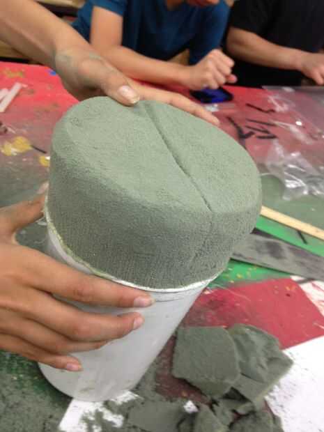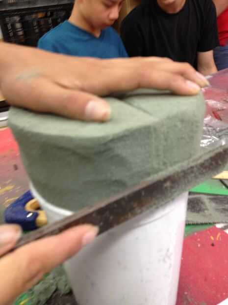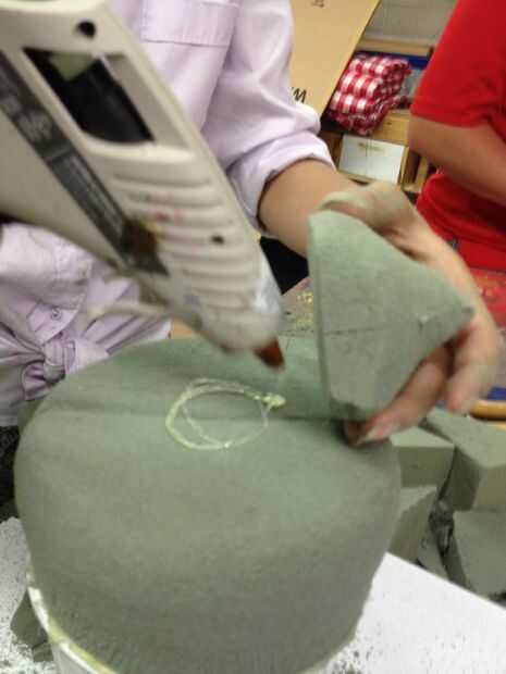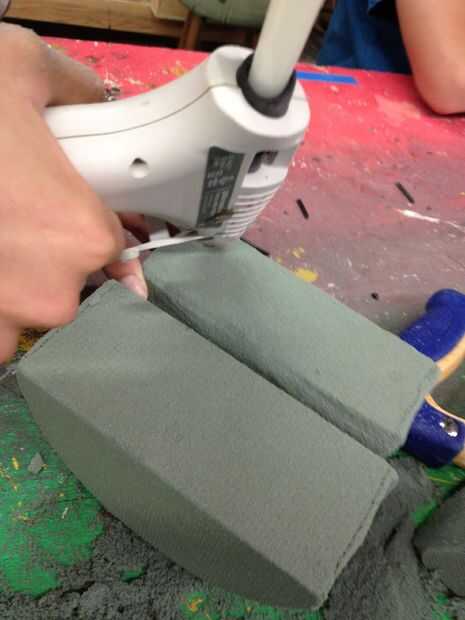 4) después de haber hecho esto, utilice pegamento caliente para pegar las dos piezas de espuma juntos.