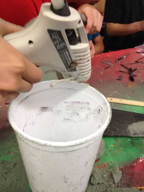 5) a continuación, poner un anillo de pegamento caliente alrededor de la taza está utilizando y su círculo en la parte superior del palillo.