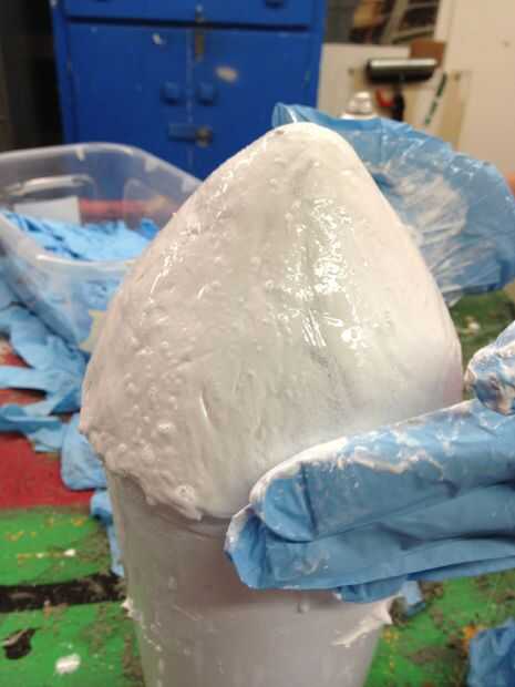 3) poner el jabón en las manos o en el látex líquido. Alisar la capa de látex hacia fuera.