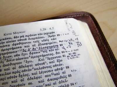 Los subrayados del texto en esta página fueron realizados con un mejor punto de bola negra de calidad. Después de muchos años, la tinta todavía ha no sangró a través al otro lado. Lo mismo es cierto del "cf v. 5" (= "ver verso 5") notación, que también se hizo con el mismo bolígrafo. El "Mt 12:28" notación fue hecha con pluma de crafter de 0,2 mm. Plumas de crafter funcionan muy bien y pueden comprarse en distintos anchos de línea. El problema es que funciona de la tinta rápidamente y no son recargables. Mientras que me gustan, dio para arriba en ellos debido a su corta vida. Creo que la "notación de BID 2" también fue hecho con la pluma de un crafter. ("BID" se refiere a un conjunto de varios volúmenes Biblia Diccionario que usar). Parece fue vuelta más adelante a añadir más detalle y utiliza una pluma de Kohinoor de punto muy fino para la "notación de p 631" y para las notaciones adicionales más allá de lo que aquí son ilegibles. La pluma de Kohinoor es un instrumento de calidad disponible en las tiendas de Bellas Artes. Son costosos y requieren mucho de la limpieza y mantenimiento para mantenerlos trabajando bien. Se puede ver la pluma de Kohinoor