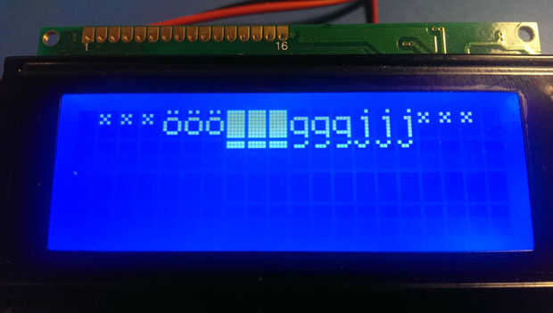 Esta siguiente sección de código también utiliza la función hd44780_write_special_char() para escribir caracteres en la pantalla. Dos de esos personajes son la minúscula 'g' y 'j'. Lo interesante a destacar es que estos dos personajes se extienden más y utilizan el patrón completo 10 puntos de la pauta de carácter de 5 x 10.