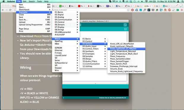 Descargar la biblioteca de Mozzi, descomprimir el archivo y ponerlo en la carpeta Arduino➞libraries. Dejar de Arduino (si está abierta) y abrirlo. Ahora debería poder ver Mozzi en la lista en Arduino➞Sketch➞Import biblioteca y también en los ejemplos.