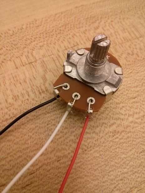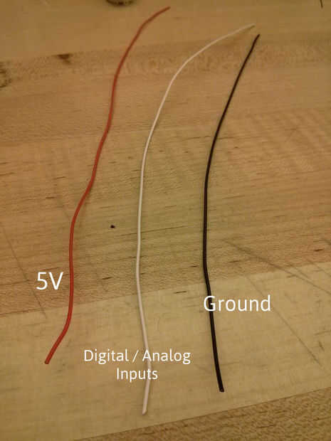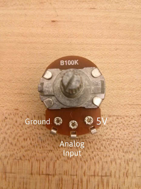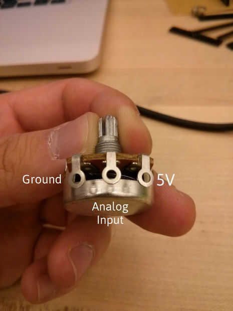 Primero Haz 5 pares de potenciómetros de 100K. La salida media del potenciómetro es siempre la salida analógica. Las otras 2 salidas izquierda y derecha son alimentación (5V) o tierra. La soldadura de los cables rojos, blanco y negro a los potenciómetros. Después de obtener suficiente de jefes hombres y soldarlos a los extremos de cada cable. Esto hará más fácil integrarlo en el Arduino luego. La razón por la que no soldadura de los cables en un escudo de proto es hacerlo desmontable por lo que puede reemplazarse por un tipo diferente de entrada como sensores.