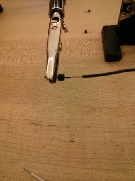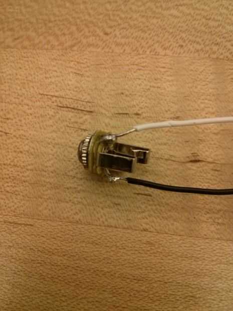 Obtener su Jack de Audio y un hilo blanco a uno de los resultados positivos de la soldadura y soldar el cable negro a la salida negativa. Después de soldadura headers macho a cada extremo de los cables, igual que los hicimos para los potenciómetros.