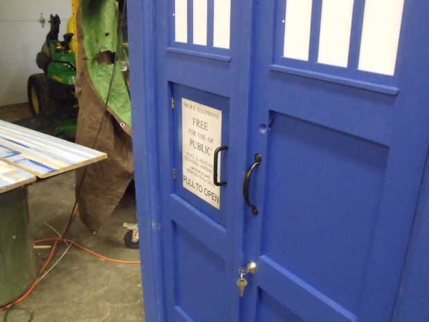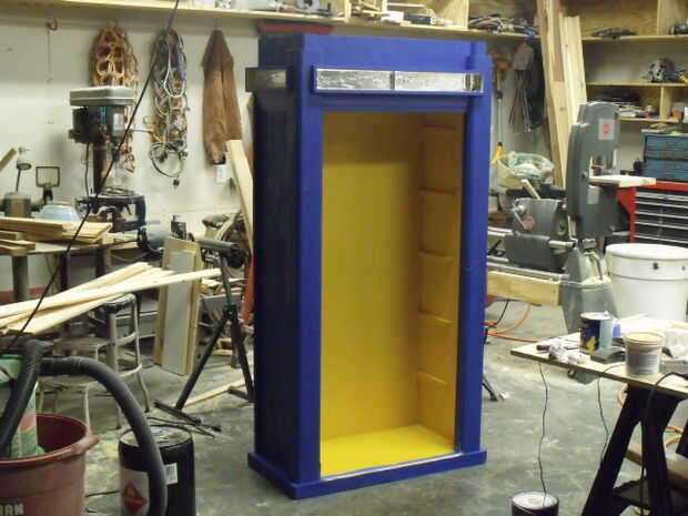 Hemos utilizado la pintura azul para el exterior y la pintura de oro para el interior (ya que es el color habitual para el interior de la Tardis. Para hacer los signos en la parte superior, compramos unas láminas de plástico acrílico (brillante pero translúcido (Asegúrese de que existe un papel protector en el plástico para esto es vital)). Nosotros entonces rocían adhesivo en cada uno de los forros de papel (sólo en un lado) de cada signo pegado la imagen de la señal de la "caja del policía del" a cada uno y cortar las Letras con un cuchillo agudo de hobbie (deje las letras sobre el plástico y retire el resto). Luego pintar los signos con la pintura negra y luego retire las letras hasta el final de los signos.