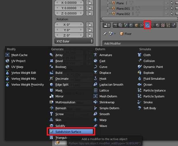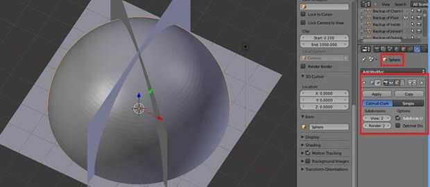 Para hacer mi esfera exterior bastante, he pinchado en el icono de Modificadores . He seleccionado Añadir modificador y añadido (y aplicar) un modificador de la Superficie de la subdivisión que.