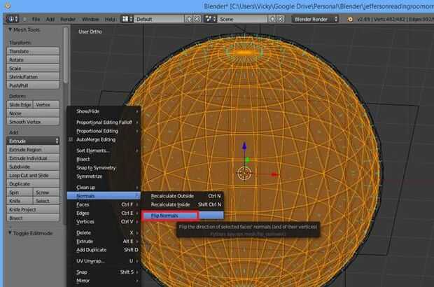 He seleccionado mi ámbito más pequeño y cambia a modo edición . He seleccionado todas las caras y luego voltea la cara normal yendo malla -> normales -> Flip Normals. Esto dice la esfera más pequeña que va a ser en el interior.