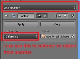 Usted puede hacer la Selección -> seleccionar borde (como Jonathan Williamson demuestra en como modelar una calabaza en la licuadora). Sin embargo, en este punto, tuve montones y montones de caras y vértices por el modificador de la superficie de subdivisión. Así que lo que hice fue agregar cubos, dimensionarlas y rotarlos para cubrir las partes de la esfera que no quería. Luego usé el Modificador Boolean para sustraer esos cubos de mi esfera.