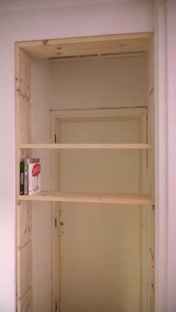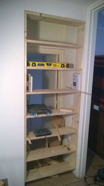 Repita este proceso hasta que se realicen todos los estantes. Quite las repisas, poner un poco de pegamento en cada ranura y toque nuevamente en. Parece una estantería ya!