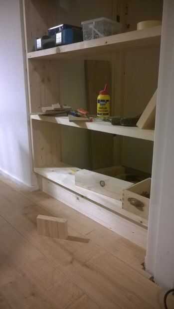 El tablero inferior del marco se utiliza como una plataforma así, pero no puede soportar el peso todavía. Simplemente cortar un trozo de tablero aproximadamente y luego recortar el ancho hasta que firmemente entre el piso y el tablero inferior. Sacó algunos tablones para permitir que la ayuda a pararse directamente sobre el piso de cemento. Tuve que golpear el soporte con un martillo para conseguirlo, que demuestra que es un buen ajuste que supongo. Pegué en dos bloques de la parte posterior, unido a la ayuda y el tablero inferior para asegurarse de que la pieza quedaría vertical (no hay foto de la que por desgracia)