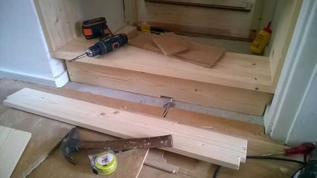 Después de poner nuevamente las tablas del suelo cortar la última de ellas a tamaño para acomodar para el apoyo. Entonces tomó un trozo más fino de pino y hace una pequeña placa que le daría un aspecto agradable. Puede pegar la placa frontal en el lugar o tornillo hacia abajo desde la parte trasera si es posible.
