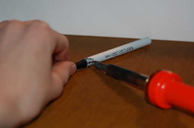 Con una sierra, cortar aproximadamente 1/2 inch(1.25cm) el extremo del tubo. Deseche ese 1/2 pulgada. Luego utilizar el taladro y broca de enlargen del agujero donde pasó la punta del lápiz por, como se muestra a continuación. Coloque la punta negra al final en que solo recortas del tubo, de manera normal. Para fundir los dos juntos para que sea una pieza sólida, utilice la plancha de leña en la grieta entre las dos piezas que los funden. El humo es dañino si inhalas mucho, así que intente no para inhalar cualquier.