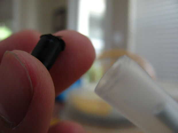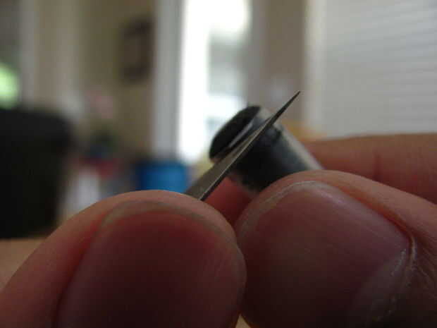 Cuidadosamente usando su cuchillo, intente cortar alrededor del plástico claro por la tapa del extremo. Esto debe desenroscar el tapón un poco, que le permite a él.