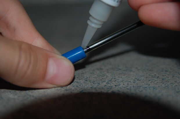 Este paso prepara su pluma de ser hecho en la pistola. En primer lugar, tire de la punta de la pluma y la tinta debe salir. Usando el alambre de percha, empuje hacia fuera la tapa del extremo en el otro lado de la pluma. Tiro el trocito que empujó fuera de la away.too tubo Prepárate la tinta, Driblar pegamento abajo el espacio entre la tina de tinta y el interior de la punta. La foto lo muestra bien. Espere que se seque completamente.
