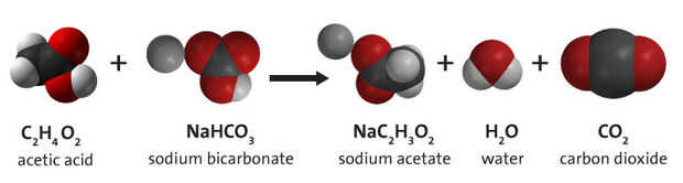 El vinagre es una solución débil de ácido acético (generalmente 5%). Bicarbonato de sodio es en polvo bicarbonato de sodio. Cuando una molécula de ácido acético reacciona con una molécula de bicarbonato de sodio produce una molécula de acetato de sodio, una molécula de agua y una molécula de dióxido de carbono. El dióxido de carbono es lo que produce la característica formación de espuma y burbujas. En un recipiente cerrado, el dióxido de carbono que se produce se acumula presión dentro del contenedor. Esta presión puede usarse para enviar una patata volando por el aire.