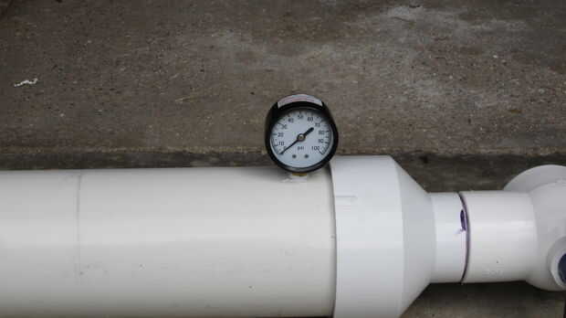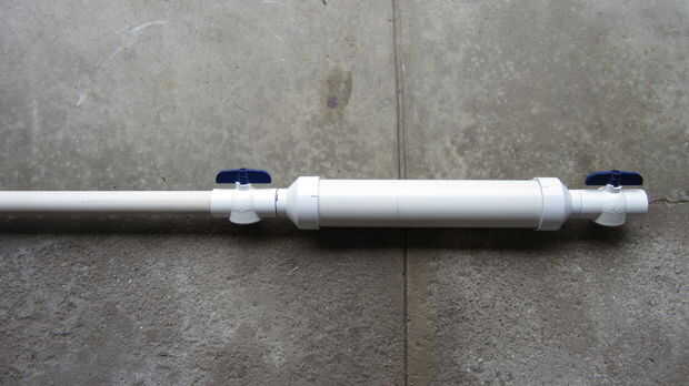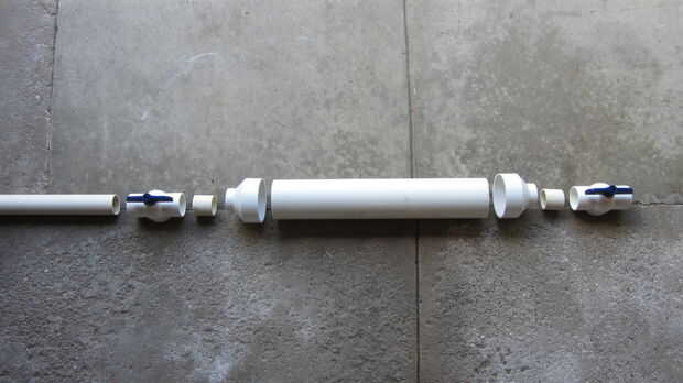 El cañón se compone de tres partes principales: la cámara de reacción, las guarniciones y el cañón. La cámara de reacción es donde se mezclan el bicarbonato y el vinagre. Un medidor de presión se monta en el lado de la cámara de reacción para controlar la presión en el interior. A cada lado de la cámara de reacción hay un reductor que le permite conectarse a tubería de diámetro 2 pulgadas. Luego un pequeño trozo de tubo de 2 pulgadas de diámetro se añade a cada lado para que usted puede conectarse a dos vávulas de bola. Las válvulas de bola que fácil de añadir los reactivos y entonces sellar rápidamente la cámara para que la presión puede acumularse. También hacen más fácil limpiar el cañón después de cada uso. Por último en un extremo hay una sección larga de la tubería de diámetro de 2 pulgadas que actúa como el cañón.