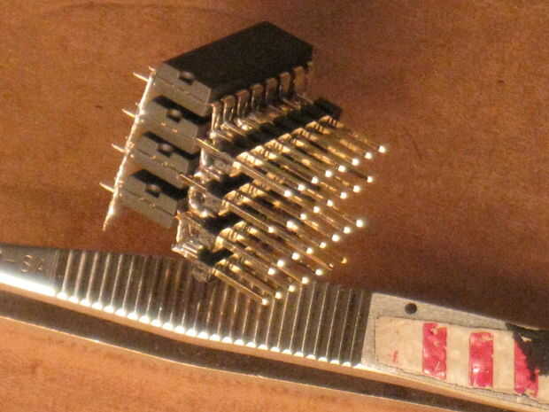 Prototipos de bicho muerto consiguieron su nombre porque cuando usted invierta un IC y dobla las piernas hacia fuera, se ve como un insecto muerto. A veces puede hacer el circuito entero trabajo simplemente soldando las piezas directamente a un IC, y la manera fácil de hacerlo es colocar el chip boca abajo, doblar las puntas a soldar las piezas entre sí. A veces la gente utiliza fichas y pega hacia abajo en un PCB en blanco, luego construir la circuitería de parte a parte.