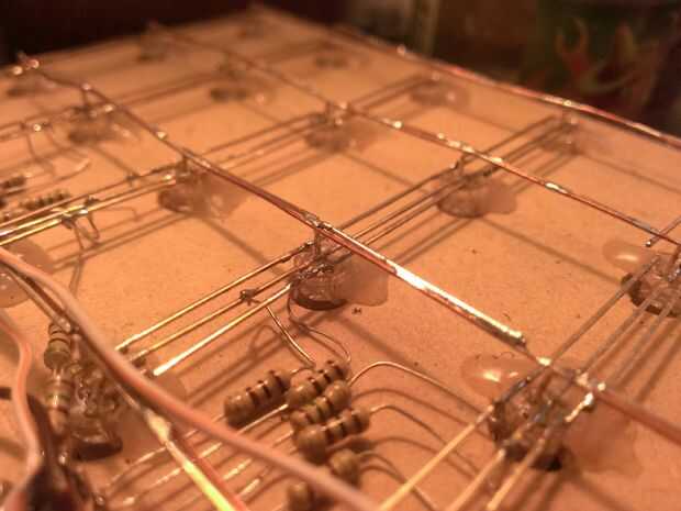 Se trataba de un prototipo que construí con 64 LEDs RGB, registro de desplazamiento 6, y un un montón de resistencias. Los registros de desplazamiento se configuran en pares, de estilo deadbug. Para obtener el cableado para trabajar hacia fuera, tenía una ficha boca abajo, al otro lado de la derecha para arriba. El interior son los controles de entrada, el exterior son las salidas. Los LEDs son también un estilo de deadbug, el LED cableado structrure mantiene todo Unido, pero los LEDs también están calientes pegadas en su lugar.