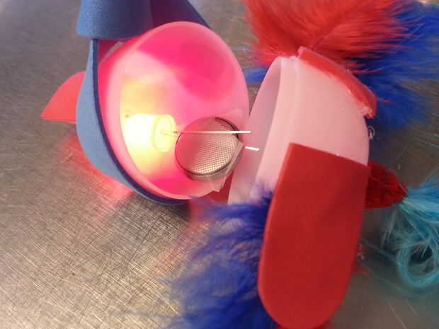 Añadir su batería led y monedas a su criatura. La cinta la llevó a la moneda celda batería-con la pata larga (pierna positiva) de la batería en el lado positivo de la batería y la otra pierna en el otro lado de la batería. Su led se estar a caballo entre la batería y deberá encenderse. Si no está encendido puede ser al revés. Coloque la que brilla intensamente en el huevo y cierre para arriba. Si no sellarlo, puede reemplazar las baterías cuando sea necesario.
