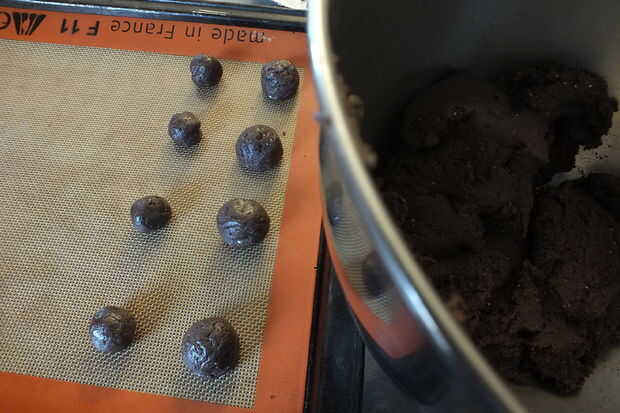 Usando una bola de masa de galleta de 1 cucharada tamaño masa y forma bolitas redondas.