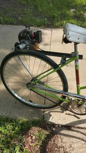 esta es mi moto con Weed Eater. Es impulsión de la fricción, como se puede ver y está montado con acero. Nosotros estábamos pensando en aluminio, pero podría ser a la luz y no bastante fuerte. el eje es uno de los tubos de bicicleta de acrobacias. La