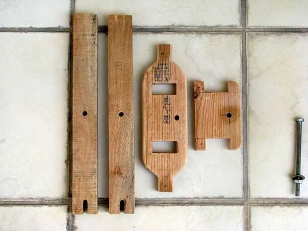 Las piezas de madera requeridas para el manejo son como se muestra en la primera foto. Se mantiene unida por una larga tuerca y un tornillo y la horquilla sí mismo se inserta en agujeros cincelados sobre la pieza superior como una mortaja y espiga común. Todo es un ajuste apretado y puede ser desmontado si es necesario.