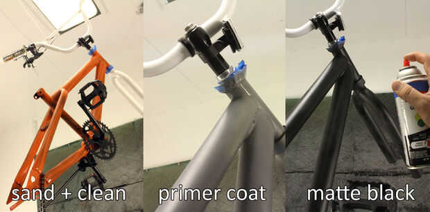 Colgar el marco de la bici por el manillar que enmascarados fuera de la articulación de la dirección y cualquier otra área que no quiero pintura (como alrededor de la carcasa del pedal y los pernos de cualquier cromo). Comenzó con una capa de imprimación gris, luego aplicar 2 manos de pintura negro mate.
