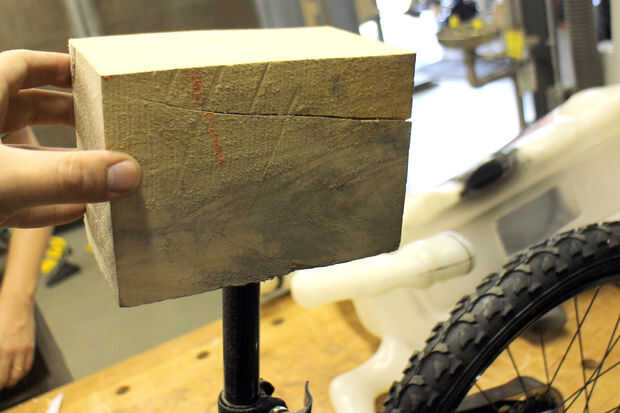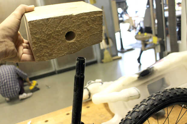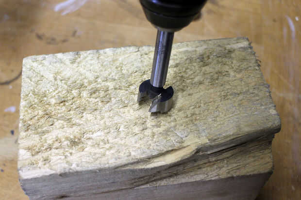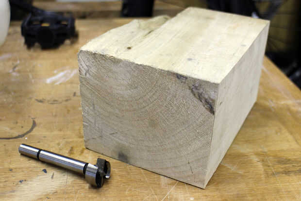 Empecé por un abertura parcialmente a través del bloque y en un pequeño ángulo, para montar sobre la tija de sillín de 1" diámetro de la perforación.