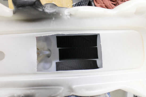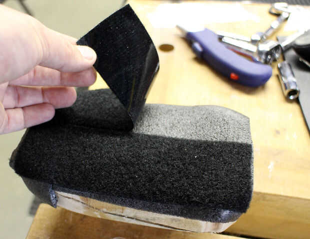 Después de que el epoxi se había secado cubrí la espuma con la parte del bucle de una tira de velcro. El correspondiente lado del gancho del velcro fue unido adentro el caballo bajo la silla de montar. Solicité más gancho lateral de velcro en el lado del caballo para permitir el asiento a cambiarse de lugar para encontrar la ubicación óptima del caballo.