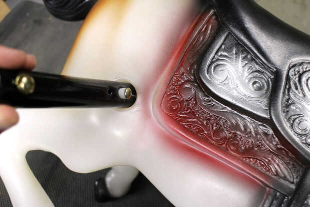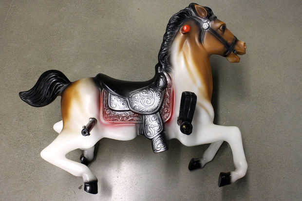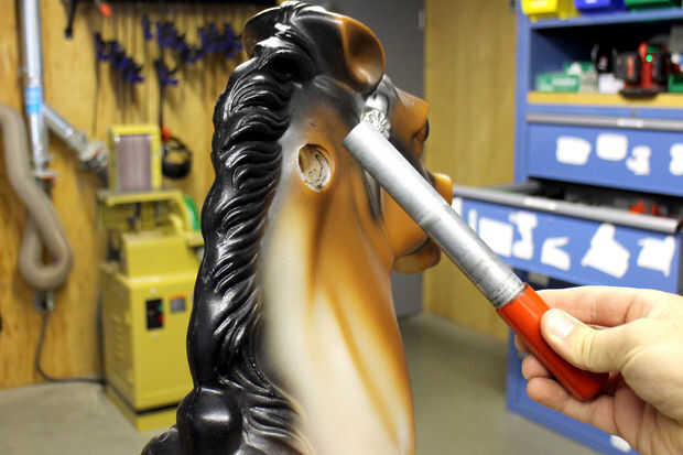 Este caballo modelo vino con estribos de plástico montados en tubo de acero que aunque el ancho del juguete. Había pequeños tornillos en ambos lados de la pipa de acero que fueron quitadas, permitiendo que el tubo se deslice hacia fuera.