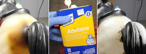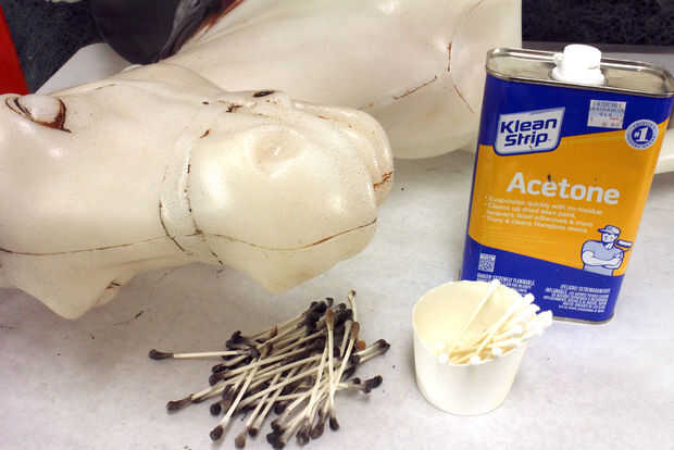 Guantes y trabajar en un área bien ventilada remojadas un trapo en acetona y comenzó el desmontaje de la pintura. Para las áreas más usé palitos de algodón y salió la pintura. Desmontaje del caballo de la pintura tomó cerca de 2 horas.