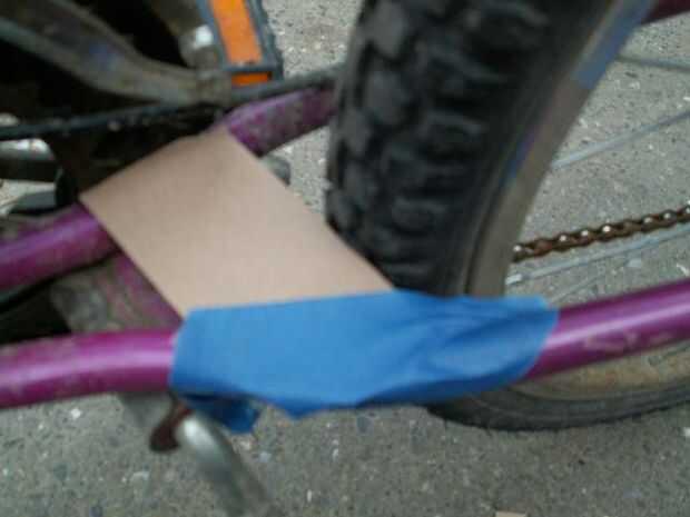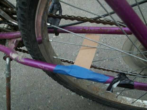 la cinta le pedazos en cualquier lugar, cerca de la rueda contra la banda de rodadura es más fuerte, también ponerlo aunque los radios funciona bastante bien, pero no es tan fuerte.