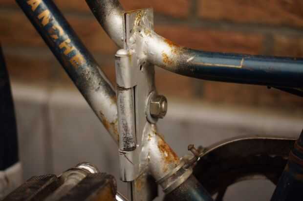Si la bisagra está cerrada, atornille una tuerca en el perno, asegúrese de usar un anillo grande entre la bisagra y la tuerca para la distribución de la fuerza. Utilicé una tuerca estándar y cada vez desplegar o plegar la bici, necesito una llave. Es más fácil si se utiliza una tuerca de mariposa, entonces se puede cerrar con las manos.