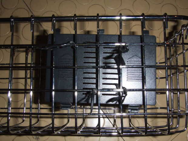 En mi primer ensayo, sólo puse la T-Amp en la cesta. Me golpeó un bache y casi había perdido. Por suerte, lo cogí por mis reflejos increíbles de Nintendo. Desde entonces usé lazos de torcedura para sujetar la tapa a la canasta. T-Amp solo clips sobre la cubierta de la batería y el cable del altavoz a través del fondo de la cesta de la alimentación.