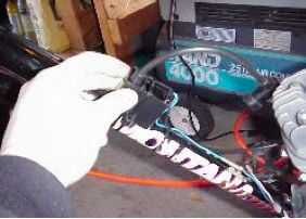 Tornillo en el combo de filtro de la válvula de combustible en el tanque y luego montar el tanque. Punta... Envuelva el tubo del armazón superior con barra abrigo donde las abrazaderas del tanque son. También... Si tienes cable funciona en la barra superior que son cables abiertos, usted puede necesitar ejecutarlas a través de la envoltura de cable la longitud del tanque en orden para que trabajen una vez que el tanque se sujeta sobre ellos. Aplique cinta de plomería al hilo en caso de fugas.