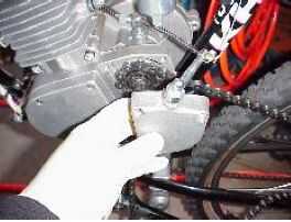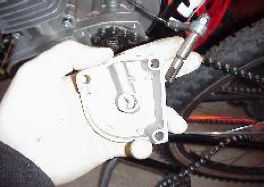 Quitar los 3 tornillos de tapa de lado del mostrador y también Quite la bujía. Retire el clip de principal eslabón de la cadena y luego hilo cadena hacia arriba y sobre la rueda dentada de eje de contador girando la rueda dentada con herramienta. Después de haber quitado el enchufe de chispa permite motor dar vuelta fácilmente a cadeneta. Punta... Ya que tienes esta tapa, brazo de embrague presionado y gire la cubierta y tire brazo fuera de la cubierta de embrague engráselo y roten de nuevo en.