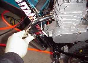 Instale el tubo de escape. Si usted necesita doblar el tubo algunos por lo que no afectará la marco o pernos, abrazadera de la tubería en los bloques de madera y doble. No doble escape montado al motor. Si lo haces... No se dobla el tubo de escape, se romperá el motor!!!! Tubo de escape es muy fuerte. Mucho más fuerte que los 2 pernos de montaje del motor.