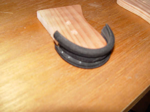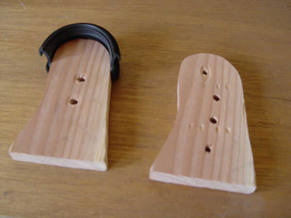 La base del pie de apoyo se hace de dos piezas idénticas de madera corta de 3/4" cedar vallado disponible en Lowes o Home Depot. La forma se crea utilizando el modelo de zapato de un niño sobre 1 o 2 tallas más grandes que el niño en la bicicleta. Cada pedal requiere dos de estas piezas, uno en la parte superior del pedal y otro en la parte inferior. Las dos piezas se intercalan en los pedales con los pernos de carruaje. Una tira de material de caucho ligero (hemos utilizado burletes automotor de J.C. Whitney y otros automóviles) se envuelve alrededor de la sanación de la ayuda del pie. Las tiras de goma se mantiene en su lugar con cemento de contacto y una serie de pequeños clavos.