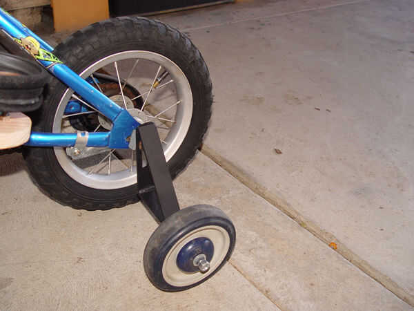 Llantitas manufacturados están disponibles para bicicletas y bicicletas más pequeñas muchas ya vienen equipados con ruedas de entrenamiento. Desafortunadamente, la mayoría de estas ruedas tienen ligeros soportes endebles y las ruedas tienen pobres rodamientos o cojinetes de no en todos. Como resultado se haga rodar bien y en realidad puede interferir con el pedaleo. Por lo tanto, construimos nuestras propias ruedas de entrenamiento. Los soportes se hacen de 1" acción amplia plana soldada en forma triangular para darles mucha fuerza. Los árboles son pernos de 3/8" con las cabezas cortadas. Se sueldan con autógena los pernos en la parte inferior de los soportes de la rueda. Las ruedas se están salvadas de carritos abandonados/desechados. A veces estas ruedas pobre "neumáticos" y la goma tendrá visible con las partes planas (estos están lo que causa síndrome de ruedas tambaleantes en la tienda de comestibles). No utilice neumáticos aplanados. Si los neumáticos están bien, las ruedas tienen rodamientos muy decentes en ellas y rodarán mucho mejor y más barato de rueditas. También, obtener estas ruedas sólo fuera desechado, roto, sin marcar (almacén identificado), abandonado los carros o carros enviados a su sitio local de la trituradora.