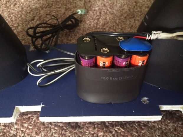 Altec Lansing BXR1120 2.5 música y juegos de azar altavoz. Originalmente fue alimentado por una fuente de 9 voltios ac. Primero traté de alimentar con un paquete de batería USB de 5 voltios dc pero el sonido fue distorsionado notablemente sobre la verruga de la pared sobre todo porque se planteó el volumen. Luego fui a RadioShack y compró un portapilas aa de 8 células para $3. Esto me dio un poco más de 10 voltios dc con pilas recargables de 1,2 voltios. Esto pareció para que coincida con el sonido de la configuración original.