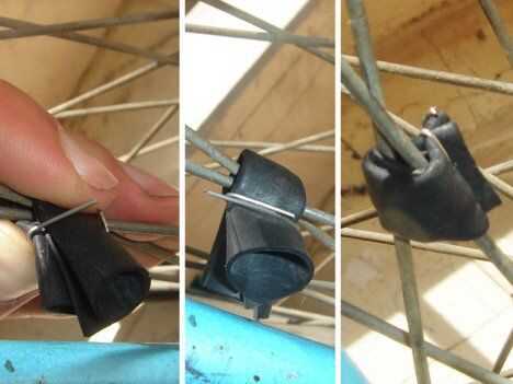 • Cortar un pedazo pequeño de tubo interno y enrollar el imán. Encontrar el punto donde dos radios cubrirán y envuelven el tubo y el imán alrededor. Tomar un pequeño trozo de alambre y doblarlo alrededor del tubo y dos radios. Gire a su alrededor hasta que de cómodo para trabajar y fijarlo con la abrazadera hacia abajo con unas pinzas (como hicimos para el gancho de la correa). Utilice tijeras para cortar el tubo interior restante. Finalmente, vuelta hasta que el imán del sensor enfrenta y empújela hacia abajo hasta que esté segura.