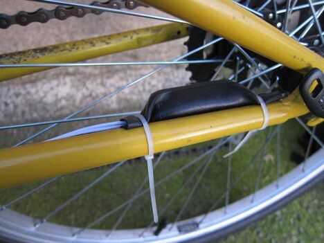 • Ahora, corte un pedazo del tubo interior y poner el sensor en su interior. Luego doblar la goma sobrante y ponga en la horquilla o el triángulo. Utilice algunos lazos zip (idealmente reutilizables) para mantener en su lugar. Utilizar algunos más abrazaderas de plástico (no usar muchos, pocos lugares encendidos donde el cable cambia de dirección) para dirigir el cable hacia el poste del asiento. Asegúrese de que el cable es discreto: debajo y detrás del marco.