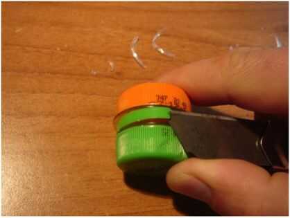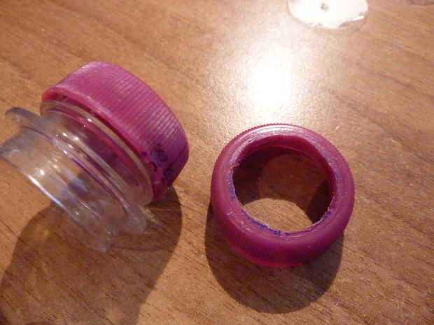 • Cuando lo tenga listo, tome a la cap que no se enrosca en la botella, y con su afeitadora abra un agujero grande en él. El agujero debe ser tan grande como el tamaño de la cavidad (que significa no destruir la cavidad interior - véase la foto).