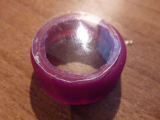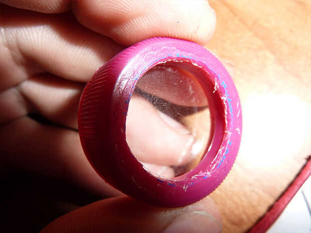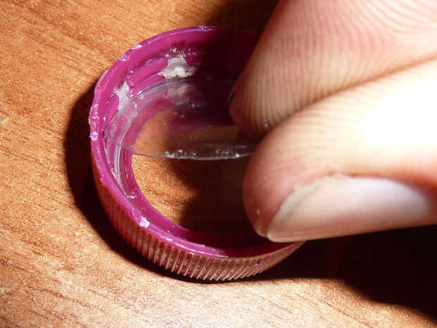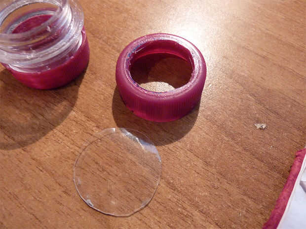• Usando otra vez el cuerpo de la botella, cortar una pieza circular de plástico lo suficientemente grande como para caber perfectamente en la tapa que acaba de hacer un agujero en la. Mientras la empuja con el dedo dentro de la tapa, debe hacer clic sonidos hasta que toque los bordes de la cavidad. Para un mejor aislamiento, poner algun pegamento de silicona alrededor de la cavidad donde va la pieza circular para sentarse.