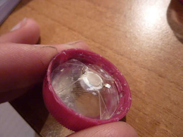 • Corte otra vez una pieza de plástico circular desde el cuerpo de la botella un poco más grande que la cubierta frontal (3-5 mm).
